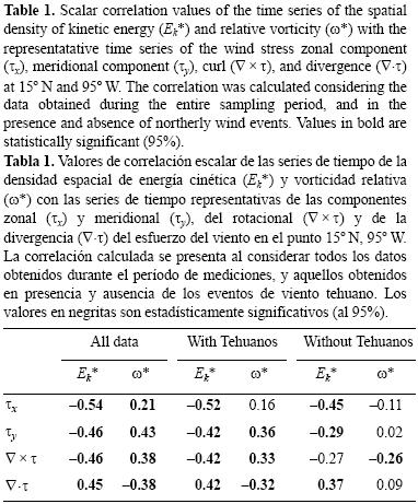 La Ek* presenta correlaciones relativamente altas (0.52, 0.42) con las dos componentes del esfuerzo del viento (τx,τy) durante los eventos tehuanos. Dado que la energía cinética es definida positiva, estas correlaciones de signo negativo indican que los aumentos de Ek* son causados por vientos hacia el SSO, es decir, con τx y τy negativas (ver fig. 1b); sin embargo, el hecho de que la magnitud de τy es mayor que la de τx sugiere que Ek* se genera principalmente por τy. En periodos con ausencia de tehuanos o durante vientos débiles la correlación con τy se vuelve débil (0.29), mientras que la correlación entre Ek* y τx es aún importante (0.45). Esto sugiere que en ausencia de eventos de viento existe cierta contribución del viento zonal para disminuir Ek*, ya que la dirección del viento (al este) es opuesta a la de la corriente costera que va hacia el polo (al oeste). El coeficiente de correlación entre ∇ x τ y Ek* sólo es significativo durante los tehuanos (0.42). Por otro lado, la relación entre ∇ · τ y Ek* es significativa tanto en la presencia (0.42) como en la ausencia (0.37) de estos eventos. Esto indica que durante los tehuanos, un ∇ x τ negativo produce aumentos de energía cinética, mientras que ∇ · τ lo hace durante todo el tiempo.