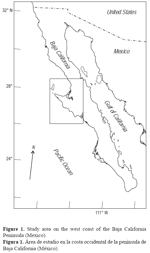 La pesca de abulón y langosta se realiza principalmente entre la isla de Cedros y punta Abreojos en la costa oeste central de la península de Baja California (fig. 1), donde trabajan nueve cooperativas pesqueras con ~1200 miembros (Ponce-Díaz et al. 1998). En 2005, se realizó una encuesta a 202 pescadores. Los cuestionarios consistieron de 14 preguntas sobre edad, género y residencia, y 26 preguntas sobre la pesca ilegal de abulón y langosta, particularmente sobre sus estimaciones del número de embarcaciones ilegales que operan en la zona cada día y la captura total obtenida por cada embarcación. El número de pescadores entrevistados en las comunidades se estableció según el número de pescadores trabajando en cada lugar: bahía Tortugas (33%), punta Abreojos (21%), bahía Asunción (19%), isla Cedros (13%), isla Natividad (6%), punta Prieta (5%) y La Bocana (3%).