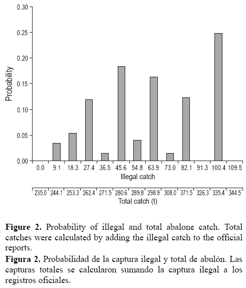La captura ilegal anual de abulón se estimó multiplicando por 365 días la captura ilegal diaria estimada a partir de la encuesta. Las distribuciones teóricas de probabilidad fueron ajustadas a los datos de pesca ilegal con los programas@Risk 4.0 (Palisade, Ithaca, NY) y Crystal Ball 7.0 (Oracle, Redwood Shores, CA), pero las distribuciones disponibles en éstos no arrojaron un ajuste satisfactorio; por lo tanto, se usó una distribución de probabilidad adaptada. La captura total se calculó sumando la captura ilegal a los registros oficiales.