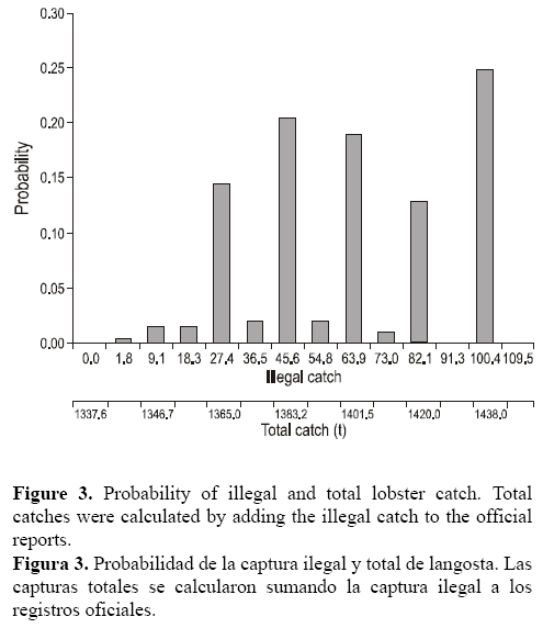 Se usaron dos métodos para realizar las estimaciones. Uno fue el mismo que se usó para el abulón, donde las distribuciones de probabilidad adaptadas fueron ajustadas a los datos de captura ilegal después de que las distribuciones teóricas no proporcionaron un ajuste satisfactorio. El segundo método usó datos sobre aranceles a langosta (género Panulirus) viva exportada a los Estados Unidos durante las épocas de veda de 1989 a 2002 (NOAA 2006). Se considera válido usar datos de langosta viva exportada durante las épocas de veda para estimar la captura ilegal ya que la mayor parte de la langosta de México se exporta a los Estados Unidos y la mayoría es langosta viva (Chaffee 2003). Usando Crystal Ball 7.0, se ajustó una distribución teórica a la captura ilegal. La captura total se estimó mediante la suma de los valores estocásticos de captura ilegal, generados por el método de muestreo Monte Carlo, a los registros oficiales.