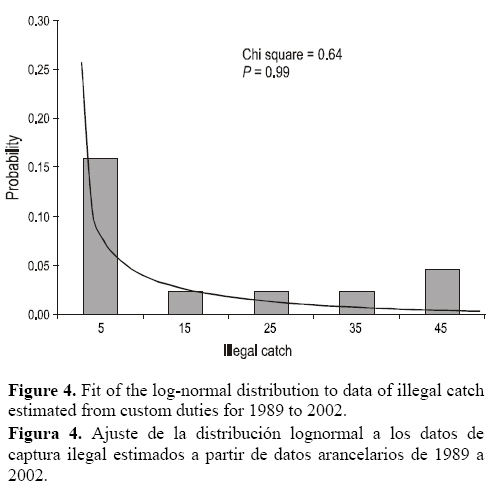 Entre las distribuciones teóricas disponibles en @Risk 5.0, la distribución lognormal mostró el mejor ajuste para la captura ilegal de langosta estimada con información arancelaria de Estados Unidos. Se estableció la distribución de probabilidad de la captura total y la captura ilegal mediante el método Monte Carlo. La captura legal fue 1298 t y la captura ilegal y captura total promedio fueron 16 y 1314 t, respectivamente. Se estimó un límite de confianza al 95% en 1346 t. Esto resulta en una subestimación de ~1.2% de la captura total promedio con base en las estimaciones de captura legal y de 3.7% con base en el límite de confianza al 95%.