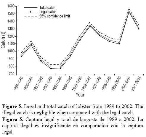 Se estimó la captura ilegal y total, así como el límite de confianza al 95% de la captura total de langosta, para el periodo de 1989 a 2002 mediante la distribución teórica log-normal (figs. 4, 5). Para la captura total promedio, la subestimación con base en las estimaciones de la captura legal varió de 3.11% a 6.1%, con un promedio de 4.5% durante este periodo.