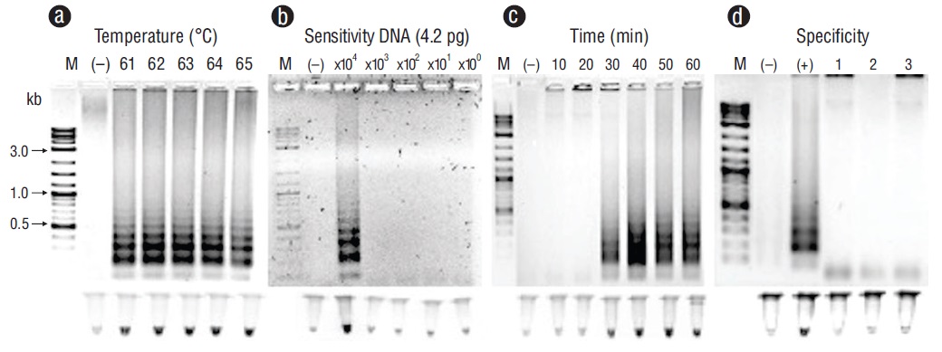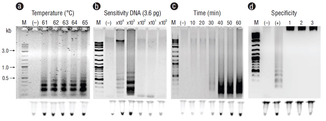 Figura 6 Optimización del gen orf191 con la amplificación isotérmica mediada por bucle para detectar el virus del síndrome de la mancha blanca (VSMB) en tejidos de Litopenaeus vannamei. (a) Temperatura (ºC). (b) Sensibilidad (pg). (c) Tiempo de reacción (min). (d) Especificidad: carril (+), VSMB; carril 1, virus de la necrosis hipodérmica y hematopoyética del camarón; carril 2, herpes virus de ostión; carril 3, virus del rizado de la hoja de la calabaza. Carril M, marcador (escalera de ADN de 2 log; kb, kilobases); carril (-), control negativo (ADN de tejido no infectado). Los productos se visualizaron en electroforesis en gel de agarosa al 2% y tubos fluorescentes.