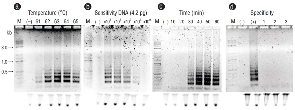 Figura 5 Optimización del gen orf36 con la amplificación isotérmica mediada por bucle para detectar el virus del síndrome de la mancha blanca (VSMB) en tejidos de Litopenaeus vannamei. (a) Temperatura (ºC). (b) Sensibilidad (pg). (c) Tiempo de reacción (min). (d) Especificidad: carril (+), VSMB; carril 1, virus de la necrosis hipodérmica y hematopoyética del camarón; carril 2, herpes virus de ostión; carril 3, virus del rizado de la hoja de la calabaza. Carril M, marcador (escalera de ADN de 2 log; kb, kilobases); carril (-), control negativo (ADN de tejido no infectado). Los productos se visualizaron en electroforesis en gel de agarosa al 2% y tubos fluorescentes.