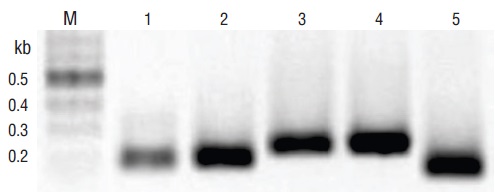 Figura 1 Patógenos identificados en tejidos de Crassostrea spp. y Litopenaeus vannamei infectados, mediante la amplificación de ADN por PCR de punto final con los cebadores externos para la amplificación isotérmica mediada por bucle (F3 y B3). Carril M, marcador (escalera 2 log ADN; kb, kilobases); carril 1 Perkinsus spp. (ITS2); carril 2, virus del síndrome de la mancha blanca (VSMB) (orf191); carril 3, VSMB (orf36); carril 4, Vibrio parahaemolyticus (hemolisina termoestable [tlh]); carril 5, V. parahaemolyticus (tox-R). Los productos de la PCR se visualizaron en electroforesis en gel de agarosa al 2%.