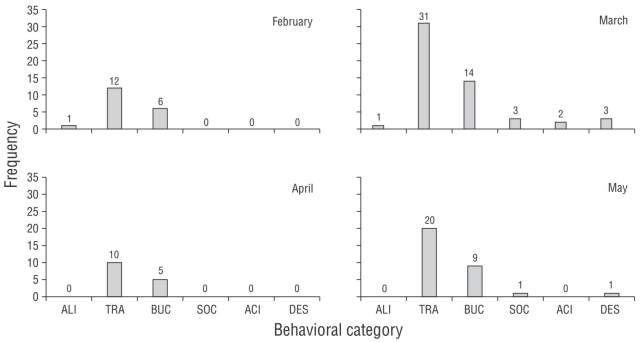 Figure 3 Frequencies of behavioral categories for the marine otter in La Ballenita (Peru) during February, March, April, and May 2019. ALI: feeding, TRA: moving, BUC: diving, SOC: socializing, ACI: grooming, and DES: resting.
