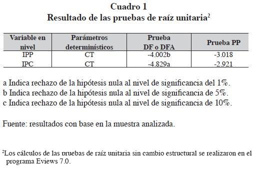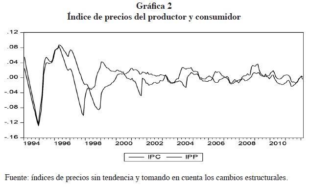 Los resultados son diferentes al trabajo de Sidaoui et al. (2009) en relación con la causalidad de precios, donde los resultados indican que la causalidad va de los precios del productor a los precios del consumidor. Sin embargo, este análisis no toma en cuenta la presencia de cambios estructurales en la modelación econométrica, ya que si existen y no son especificados en el modelo se podría llegar a conclusiones incorrectas. De acuerdo con el resultado de la prueba de raíz unitaria que permite dos cambios estructurales, las series son integradas de orden cero o son estacionarias alrededor de una tendencia determinística (y no estocástica) con dos cambios estructurales y no es posible realizar el análisis de cointegración. De esta manera, las acciones en materia de política monetaria para estabilizar el poder adquisitivo y los precios del consumidor afectan el comportamiento de los precios del productor, y no los precios del productor afectan a los precios del consumidor.