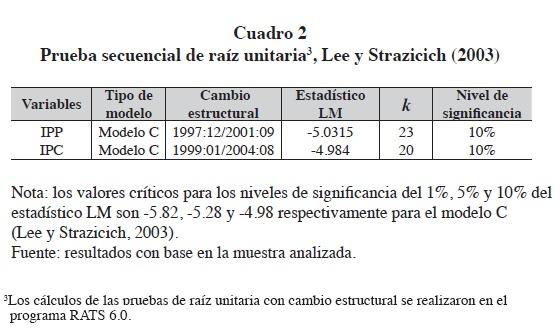 El resultado de esta causalidad de los precios en ambos sentidos para el caso de México es diferente a lo encontrado por Sidaoui et al. (2009), quienes argumentan que la causalidad va del IPP a PPC. Sin embargo, su análisis no toma en cuenta la presencia de cambios estructurales en la modelación econométrica, ya que si existen y no son especificados en el modelo se podría llegar a conclusiones incorrectas.