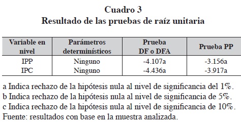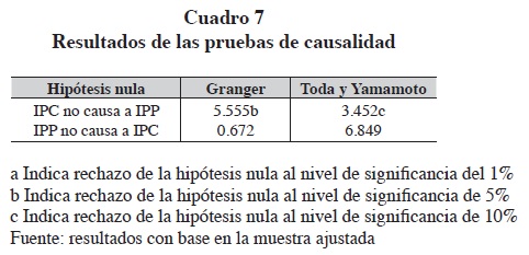 En el cuadro 3 los resultados muestran que ambas series son estacionarias, ya que las dos pruebas rechazan la hipótesis nula de raíz unitaria. Una vez realizadas las pruebas de causalidad, los resultados se presentan en el cuadro 4. Éstos indican que la causalidad va en ambos sentidos, del IPP al IPC y de estos últimos a los primeros con un nivel de significancia del 1% en la prueba de Toda y Yamamoto. Sin embargo, en el caso de la prueba de Granger, la causalidad es unidirección, del IPC al IPP a un nivel de significancia del 1%. De esta manera, la relación de causalidad del IPP al IPC no es concluyente.