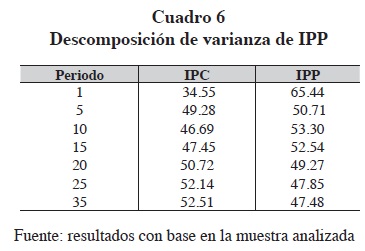 Analizando el cuadro 5, se observa que el IPC tiene un fuerte comportamiento autorregresivo, ya que después de 35 meses, el 98.91% de la varianza pueden ser atribuida a choques sólo en el IPC, mientras que el resto es explicado por el IPP. Esto muestra una muy poca participación de IPP en la explicación. En este mismo sentido, en el cuadro 6 se muestran los resultados para el IPP, en donde el porcentaje de variación explicados por choques en el IPC muestran un crecimiento hasta alcanzar el 52.51% después de 35 meses, el resto es explicado por choques en el IPP, que muestra una participación decreciente. Estos resultados confirman que la causalidad va en un solo sentido, del IPC a IPP y no en ambos.