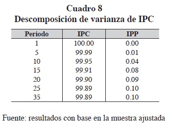 En el cuadro 8 se muestra la descomposición de varianza de IPC, también se observa nuevamente que el IPC tiene un fuerte comportamiento autorregresivo. Después de 35 meses, el 98.91% de la varianza es explicada por choques del mismo IPC, mientras que el resto es explicado por choques del IPP.