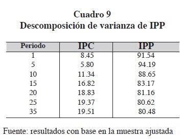 Por otra parte, en el cuadro 9 se muestran los resultados para el IPP en donde el porcentaje de variación explicados por choques en el IPC alcanzan el 52.51% después de 35 meses, mientras que el resto es explicado por choques en el IPP. Estos resultados confirman también para este periodo que la causalidad va del IPC al IPP.