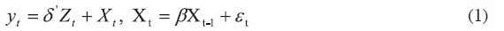 donde: Zt contiene variables exógenas y εt = iid NI(0,σ2). Para esta prueba, en el modelo A se permiten dos cambios estructurales en el nivel y en el Modelo C se permiten dos cambios estructurales en el nivel y en la pendiente. Para el caso del primer modelo Zt = [1,t,D1t ,D2t]' donde Djt = 1 para t ≥ TBj + 1, j = 1,2, y 0, de otra forma; TBj es el periodo del cambio estructural. Para el modelo C, que permite dos cambios estructurales en el intercepto y la pendiente de la tendencia Zt = [1,t,D1t ,D2t, D1t D2t]' donde DTjt = 1 para t ≥ TBj + 1 ,j = 1,2 y 0 de otra forma. El pgd incorpora los cambios estructurales bajo la hipótesis nula y la alternativa y se determinan endógenamente.