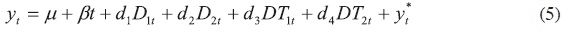 Regresando a los resultados de la prueba LS, entonces no habría necesidad de transformar los datos en primeras diferencias o aplicar pruebas de cointegración. Para eliminar la tendencia determinística e incorporar los cambios estructurales; para cada serie se estimó la ecuación siguiente (Fernández, 1997; Islam, 2001):