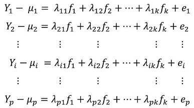 Model. The factor analysis model that describes the covariances or correlations of a set of observable variables y1,y2, …,yp in terms of a reduced number of latent, non-observable common factors is presented in its developed form as a system of linear equations in (1) (OECD & JRC, 2008; Peña, 2002; Timm, 2002).