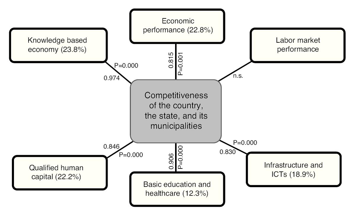 The empirical application of the CM3L model shows that upon verification, the hypothesis for 5 determinant factors that influence on the competitiveness of the entities was proven. These are: economic performance, infrastructure and ICTs, basic education and healthcare, qualified human capital, and knowledge based economy. Regarding the labor market performance determinant, it was found that it was not significant due to the variables not being sufficiently correlated, which means that said variables have had a plausible relation or rather that in this type of analysis where the perspective of time (more than a year) cannot be distinguished; with said variables, causality cannot be proven. This does not mean that this factor ought to be eliminated from the conceptual model, but that this dimension needs to be proven using other disaggregated variables at the municipal level including the perspective of time.