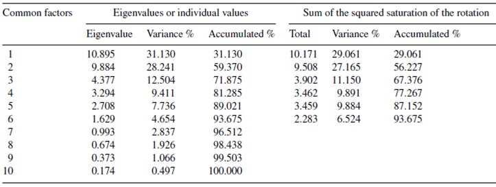 As previously mentioned, based on the empirical evidence of related investigations, and with the support of the statistic program SPSS 17.0 and Minitab 17.0, it was possible to identify the reduction of the 35 initial variables into 6 common factors that provide a 93.675% total explained variance, utilizing in said analysis the criterion of eigenvalue4≥ 1 in its standardized variables, as shown in Table 2. This represents both the non-rotated components matrix as well as the rotated components matrix. The six common factors previously mentioned were also used as support to elaborate Tables A1, A2 and A3.