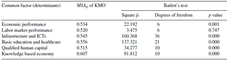Table 3 shows the results, demonstrating that both tests determine that the factor analysis is adequate to study the interrelations between the variables of each common factor, except for the labor market performance determinant, due to the fact that its level of significance is too low (0.747). This is the result of proving the absence of significant correlations between the variables defined in this factor. In other words, it proves the null hypothesis that states that the determinant of the correlation matrix adjusts to the identity. Therefore, the labor market performance determinant should not be used in the factor analysis. On the other hand, the knowledge-based economy determinant was accepted with 10 degrees of freedom, due to having delimited one of the variables (candidates) for having aMSA j value < 0.5, meaning it presented a rather low partial correlation index with regard to the group of variables in said determinant.