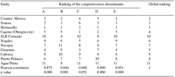 As pointed out by Garza (2010), it is worth noting that the achieved competitiveness ranking of the entities is very similar if only the economic performance determinant is taken into consideration. This is due to this determinant presenting a high composite (or global) multiple linear correlation or Pearson correlation. However, in the case of this study, the interpretation of the global ranking is more complete as it includes the information of the set of competitiveness determinant factors.