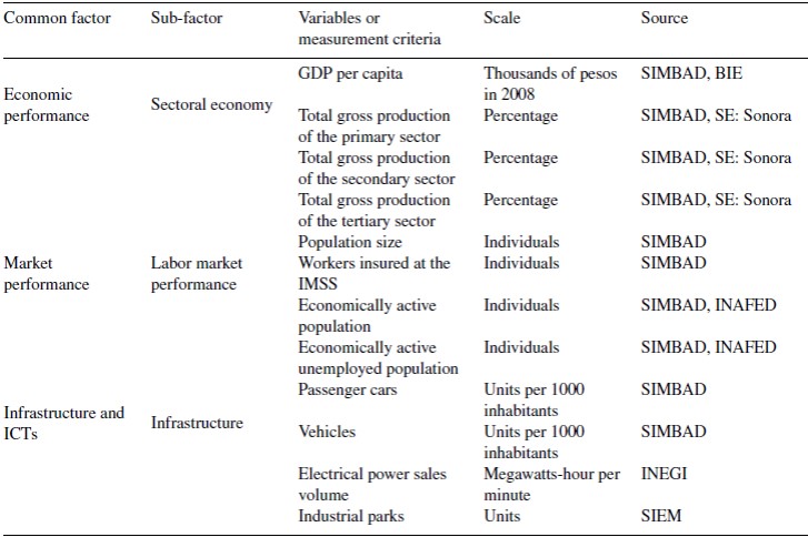 Data:the instrument, sources of secondary information, and study variables. A competitiveness conceptual model was designed to characterize the entities that are the object of study (Fig. 1, of the results section) based on the review of the literature and addressing consistency with the definition and conceptual framework. The main problems faced in creating a model are: the lack of disaggregated information available at the municipal level, for it to be in accordance with the theoretical framework, the credibility of the information, and its availability to the public. Considering these challenges, the construction of the CM3L benefits from the databanks of the INEGI and other official sources. The data matrix comprised of 6 factors, 8 sub-factors, and 35 criteria utilized to evaluate the 11 entities for the 2010 analysis period are shown in the annex of Tables A1, A2 and A3.