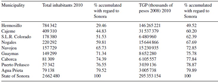Object of study and sample selection. The entities that are the object of study correspond to nine municipalities, which are part of the State of Sonora and to which they are contrasted, and are then in turn contrasted with those at the country level. The sample taken from these nine municipalities that represent the state, out of a total of 72, were selected based on two criteria (Garza, 2010; IMCO, 2007): (1) That they concentrate 80% of the state population, and (2) That they concentrate 80% of the total gross production (TGP) of the state.Table 1 contains the noted information.