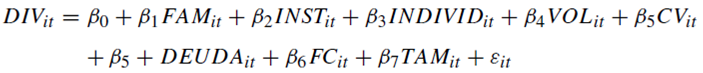 In this work, the panel data methodology was used. In the first model, the impact of owner structure on the payment of dividends was analyzed, as well as a series of control variables such as volatility, size of the company, available cash flow, and value creation. In models two and three, the estimation is done taking into consideration the ownership concentration in institutional shareholders (mainly banks), as well as those blocks of individual shareholders that do not correspond to the controlling family (we considered individual and institutional shareholders, such as those that have ownership of five percent or more of the company). The resulting model is the following: