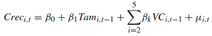 where Crec i,t represents the growth of bank i in year t, which is explained by the size of the entity in the previous year, represented by Tam i,t-1 , along with a set of control variables that represent profitability, the level of solvency, the percentage of the off-balance sheets, the liquidity rate, and default rate. Finally, β k are the parameters to be estimated and μ i,t is the error term.2