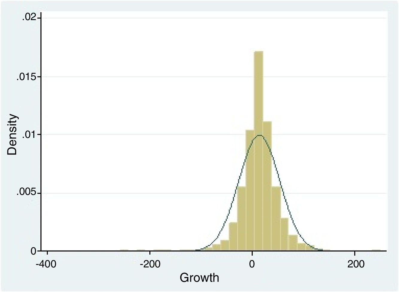However, according to Leitão, Nunes, and Serrasqueiro (2010), it is not possible to contrast Gibrat's Law based on the growth distribution of the companies, since the use of the quadratic regression methodology, taking as a reference the distribution of the growth of the sample companies as a whole, is appropriate for this purpose. In this manner, the approximation of the distribution of the rates of growth of banking in Brazil in a normal distribution can be seen in Fig. 2. In said figure, it can be observed that there are a greater number of entities with positive growth rates, with most of them being around the central values close to 14% growth.