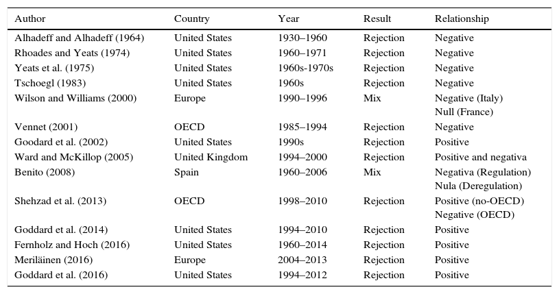 Table 1 presents a revision of works that analyze bank growth through the contrast of Gibrat's law. As we can see, these studies focus in the analysis of banking in the United States and Europe, presenting non-conclusive results. It is possible to observe a negative relation between banking growth and size in the first studies, implying that the smaller entities are the ones with the most growth (Alhadeff & Alhadeff, 1964; Rhoades & Yeats, 1974; Tschoegl, 1983; Vennet, 2001; Wilson & Williams, 2000; Yeats et al., 1975). Conversely, most recent works find evidence of a positive influence of size on growth, with the biggest entities being the ones with the most growth (Fernholz & Hoch, 2016; Goodard et al., 2002; Goddard et al., 2014; Goddard, McKillop, & Wilson, 2016; Merilainen, 2016; Shehzad et al., 2013).