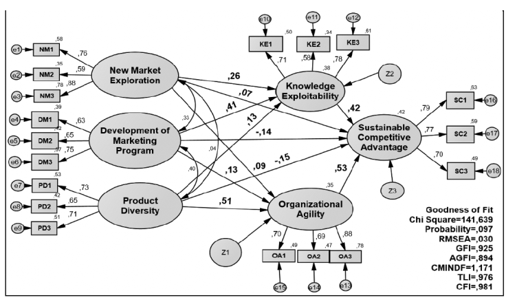 H1a, H1b, H1c: new market exploration significantly affects knowledge exploitability, organizational agility, and sustainable competitive advantage