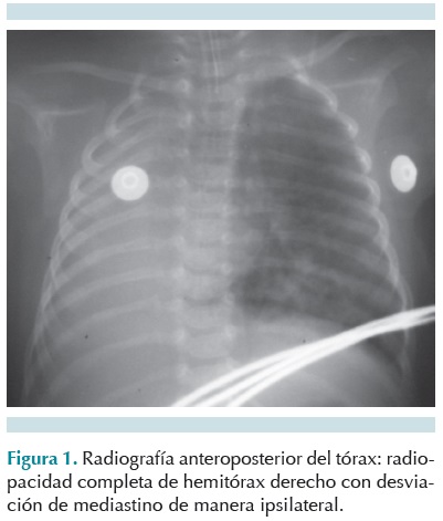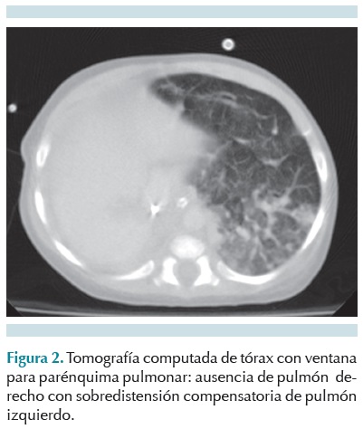 Al mes de vida ingresó por dificultad respiratoria en nuestra unidad hospitalaria. En la exploración física se observó tórax asimétricos con matidez a la percusión del hemitórax derecho; en la auscultación, ausencia ipsilateral de los ruidos respiratorios, en el hemitórax izquierdo abundantes estertores crepitantes y sibilancias basales. Una radiografía anteroposterior de tórax mostró opacidad total de hemitórax derecho, con sospecha de agenesia pulmonar. La paciente evolucionó clínicamente mal, requirió intubación orotraqueal y ventilación mecánica. Un ecocardiograma mostró dextrocardia, coartación aórtica preductal, persistencia de conducto arterioso amplio, hipertensión arterial severa de 63 mmHg, dilatación de cavidades izquierdas, hipertrofia del ventrículo derecho, foramen oval permeable, artería subclavia izquierda aberrante. La tomografía computarizada de tórax (simple y contrastada) con ventana para parénquima pulmonar reveló ausencia de pulmón derecho y sobredistensión del pulmón izquierdo, desalojado hacia la derecha. Se diagnosticó agenesia pulmonar derecha. La paciente tuvo deterioro hemodinámico y ventilatorio con eventos de broncoespasmo y crisis de hipoxia refractarios al tratamiento que causaron acidosis respiratoria con hipercapnia a pesar del manejo ventilatorio. Tuvo mala evolución clínica hasta su fallecimiento (Figuras 1 y 2).