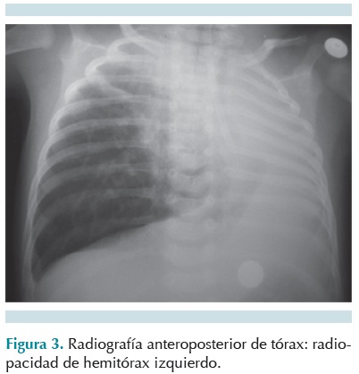 Niño, producto de la primera gesta, de madre de 17 años con antecedente de amenaza de aborto a los tres meses. Recibió hierro y ácido fólico desde el quinto mes de embarazo. Se le realizaron dos ultrasonidos prenatales que se reportaron normales. El niño nació por vía vaginal, mostró esfuerzo respiratorio espontáneo al nacimiento, Apgar 8/9, peso al nacer 2 100 g, talla 41 cm. Durante un mes se le hospitalizó en la unidad de cuidados intensivos por presentar dificultad respiratoria; requirió ventilación mecánica. Una radiografía de tórax propició la sospecha de derrame pleural. Fue enviado a nuestra unidad para evaluación. A su ingreso se observó paciente con tórax asimétrico por disminución del diámetro anteroposterior del hemitórax izquierdo, con disminución de los movimientos respiratorios ipsilaterales y matidez a la percusión. A la auscultación ausencia de los ruidos respiratorios. Hemitórax derecho con abundantes estertores crepitantes. La radiografía de tórax mostró radiopacidad de hemitórax izquierdo. Se realizó tomografía de tórax con ventana para pulmón en la que se observó ausencia de pulmón izquierdo. Con una broncoscopia se verificó la ausencia de bronquio principal izquierdo. Un ecocardiograma permitió ver una comunicación interauricular pequeña e hipertensión arterial pulmonar leve (35 mmHg). A los tres meses de vida el paciente ingresó nuevamente a nuestra unidad por neumonía adquirida en la comunidad. Se le trató con antimicrobiano y tuvo una evolución satisfactoria, por lo que fue egresado (Figuras 3, 4, 5 y 6).