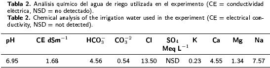 El diseño utilizado fue completamente al azar con arreglo factorial 4×3 y cinco repeticiones, en donde el primer factor fueron los sustratos: CEPT, CEMT, CEMZT y VEPT y el segundo factor fueron los niveles de 100, 75 y 50 % de sustrato. El porcentaje faltante para completar 12 kg de mezcla en la bolsa fue cubierto con arena de río como medio inerte, que se lavó y esterilizó con una solución de hipoclorito de sodio a 5% (Rodríguez et al. 2008). Lo anterior, generó 12 tratamientos, regados únicamente con agua de pozo sin adición de fertilizantes. Para conocer la calidad del agua utilizada para regar a los tratamientos y el testigo se analizó una muestra de agua, a la cual se le determinó el pH por potenciometría, conductividad eléctrica (CE) por puente de conductividad, HCO3 y CO3 por volumetría de neutralización, Cl por argentometría, SO4 por turbidemetría; K, Ca, Mg y Na por espectrofotometría de absorción y emisión atómica (Etchevers 1988). Como sustrato testigo se utilizó tepetzil regado con la solución nutritiva de Zaidan con las modificaciones propuestas por Rodríguez et al. (2008). El ciclo del cultivo fue de 120 días.