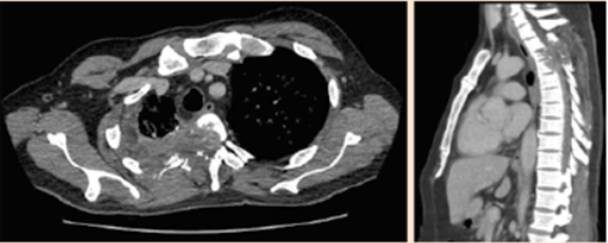 En la tomografía computada de tórax sin contras-te se evidenció una lesión proliferativa maligna que afectaba las vértebras D3 y D4 con daño al canal medular, forámenes derechos y apófisis espinosa de D3, así como arcos costales 3, 4 y 5 derechos (Figura 1). Además, se observó empiema pleural derecho, nódulos bronquiales pulmonares izquierdos de aspecto infeccioso, lesiones pleuroparenquimales derechas residuales con múltiples bronquiectasias y ganglios mediastinales significativos (Figura 2).