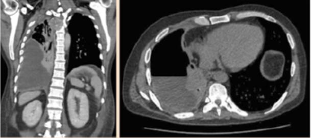 A su ingreso a hospitalización, se observaron en la exploración física las siguientes funciones vitales: presión arterial 80/50 mmHg, frecuencia cardiaca 117 por minuto, frecuencia respiratoria 18 por minuto, PaO2 de 97% y temperatura corporal de 37ºC. En el examen de tórax y pulmones, a la inspección se observó una expansión asimétrica del tórax, el murmullo vesicular estaba abolido en dos tercios inferiores del hemitórax derecho. Al examen neurológico, se encontraba orientado en tiempo, espacio y persona con Glasgow de 15/15, paraplejía (0/5), anestesia en el miembro inferior derecho, hipoestesia en el miembro inferior izquierdo, sensibilidad disminuida desde el nivel del dermatoma T3, frialdad y pulso pedio disminuido en el pie derecho. No se palparon adenopatías.