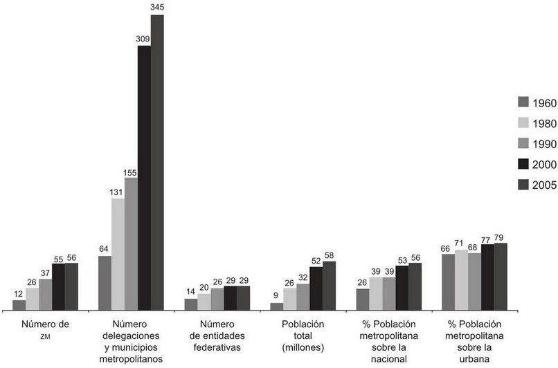 La metropolización fue propiciada en gran medida por el impulso al desarrollo industrial, y se caracterizó por una fuerte centralización del empleo y la producción manufacturera en la Ciudad de México. La centralización económica estimuló el movimiento migratorio del campo a la ciudad de carácter definitivo. En adelante el fenómeno urbano-metropolitano se empezó a extender, de manera que a partir de los setenta el país dejó de ser predominantemente rural. Luis Unikel refiere la existencia de cinco metrópolis en los años cuarenta; en los sesenta se reconocían 12 zonas metropolitanas; en los ochenta 26; en los noventa 37, y en el año 2000 el Instituto Nacional de Estadística Geografía e Informática (INEGI), el Consejo Nacional de Población (Conapo), la Secretaría de Desarrollo Social (Sedesol) y la Secretaría de Gobernación (Segob) reconocieron 55. En 2005 se instituyeron las 56 zonas metropolitanas oficiales actuales, que representan sólo 7% de la superficie del país pero albergan 56% de la población total nacional y 79% de la población urbana, al tiempo que generan alrededor de 75% de la producción del país (Sedesol et al., 2007). Como se observa en la gráfica 1, actualmente el sistema metropolitano agrupa un total de 345 municipios (incluyendo las delegaciones del Distrito Federal), y 29 entidades federativas (incluyendo el Distrito Federal) albergan al menos una zona metropolitana.