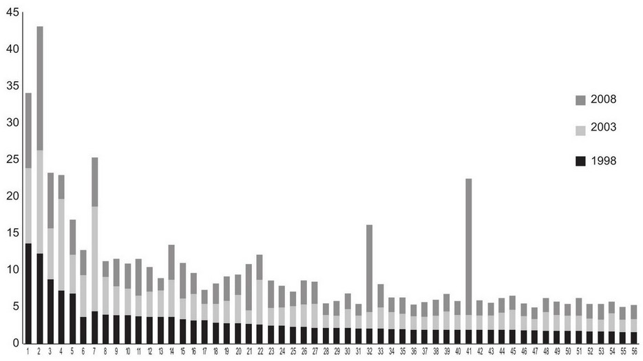 GRÁFICA 4. Principales zonas metropolitanas por eficiencia técnica, 1998, 2003 y 2008