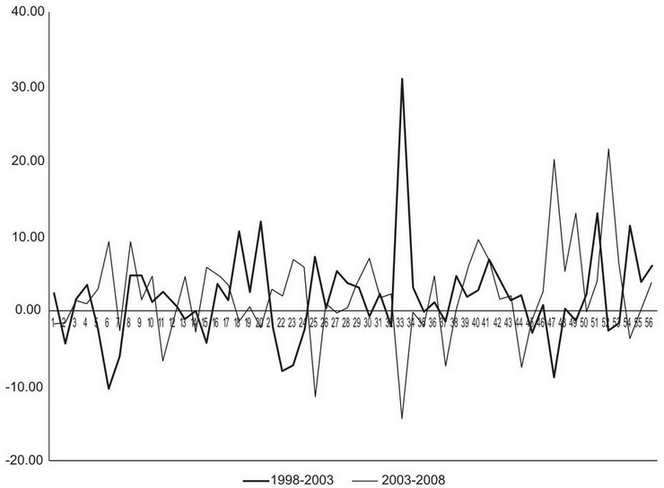 GRÁFICA 3. Tasas de crecimiento promedio anual del PIB per cápita por ZM 1998-2003 y 2003-2008 (%)