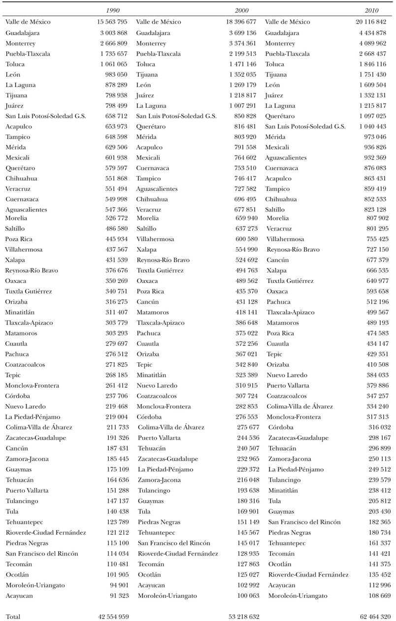 Por el tamaño de su población las mayores zonas metropolitanas en 2010 son: Valle de México (ZMVM), Guadalajara (ZMG), Monterrey (ZMM), Puebla-Tlaxcala (ZMPT) y Toluca (ZMT); todas ellas con más de un millón de habitantes, entre las cuales destaca la ZMVM por sus 20 millones de personas. Tres de estas metrópolis se ubican en el centro del territorio nacional (ZMVM, ZMPT y ZMT) y forman parte de la megalópolis a la que se refiere Garza. Por otro lado, las zonas metropolitanas más pequeñas son: Tecomán, Ocotlán, Rioverde-Ciudad Fernández, Acayucan y Moroleón-Uriangato, que en general no alojan a más de 150 mil habitantes y se localizan en la franja del país que cruza el occidente, el Bajío y el oriente.