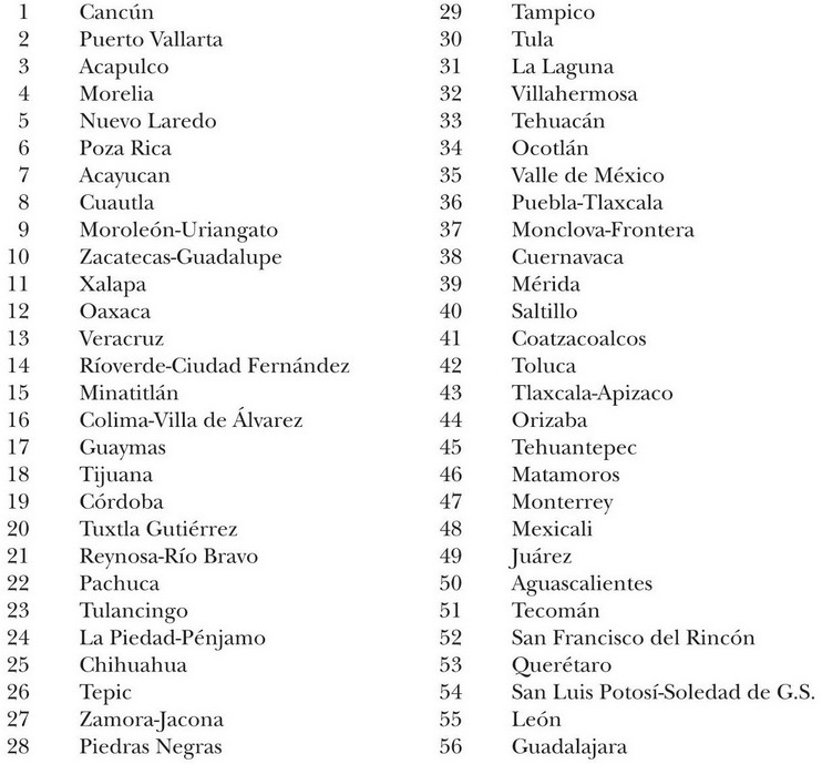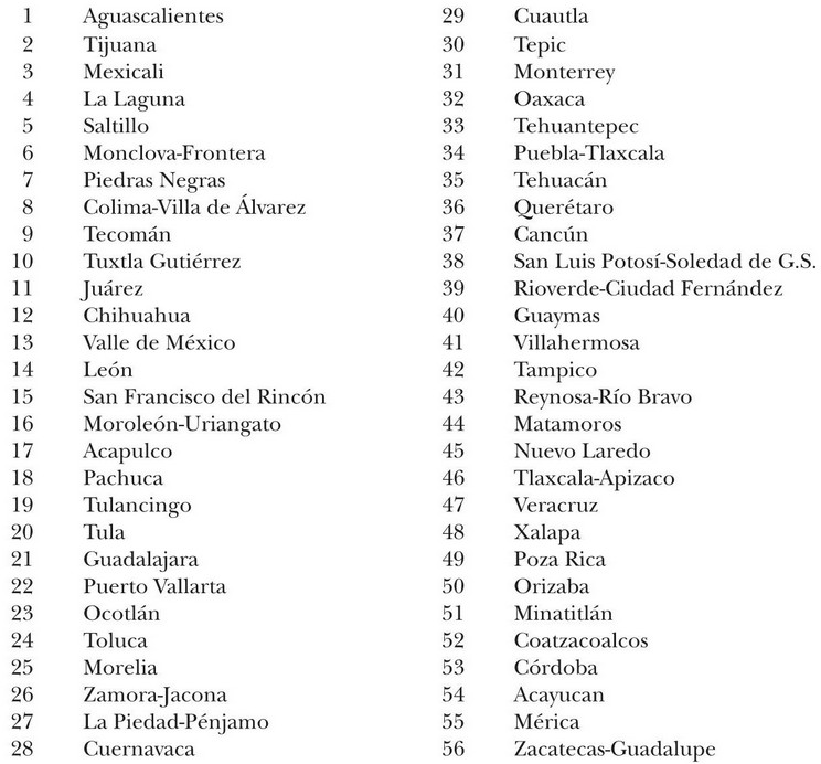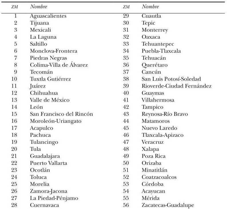 De las 56 zonas metropolitanas, 7 se localizan en el norte en la frontera con Estados Unidos (Tijuana, Mexicali, Ciudad Juárez, Piedras Negras, Matamoros, Nuevo Laredo, y Reynosa-Río Bravo); 9 son portuarias o albergan desarrollos marítimos o turísticos (Tijuana, Guaymas, Puerto Vallarta, Tecomán, Acapulco, Cancún, Coatzacoalcos, Veracruz y Tampico); las restantes se encuentran en el interior, y una proporción sustancial de ellas se asienta en el centro del país (mapa 1).
