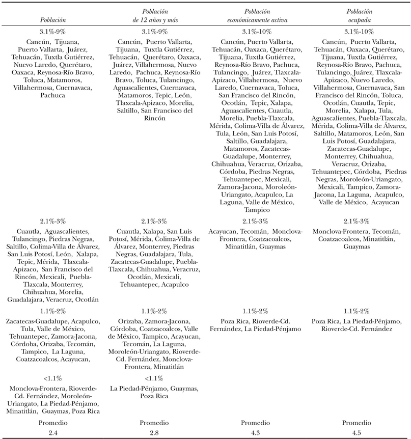 Aquí se presenta el panorama de la diferenciación espacial interurbana en el crecimiento poblacional, de la población en edad de trabajar (que es un indicador de la oferta de trabajo potencial), de la población económicamente activa o PEA (que indica el nivel de actividad de la población), y de la población ocupada (PEA con empleo) en los periodos 1990-2000 y 2000-2010 en cada zona metropolitana. En el decenio comprendido entre 1990 y 2000 se encuentran entre las cinco zonas metropolitanas con mayor crecimiento las dos metrópolis fronterizas que Garza identifica como las de mayor crecimiento entre 1990 y 1995: Ciudad Juárez y Tijuana; dos polos turísticos: Cancún y Puerto Vallarta; y Tehuacán en Puebla. En cambio las que menos crecen son las pequeñas zonas metropolitanas de Veracruz y Guanajuato, y Guaymas en Sonora. En esta década las zonas metropolitanas fueron en promedio y en número más dinámicas en el crecimiento de la población económicamente activa y de la población ocupada que en el crecimiento poblacional (cuadro 2). Es decir, la oferta laboral activa y la ocupación se incrementaron más que la población total.