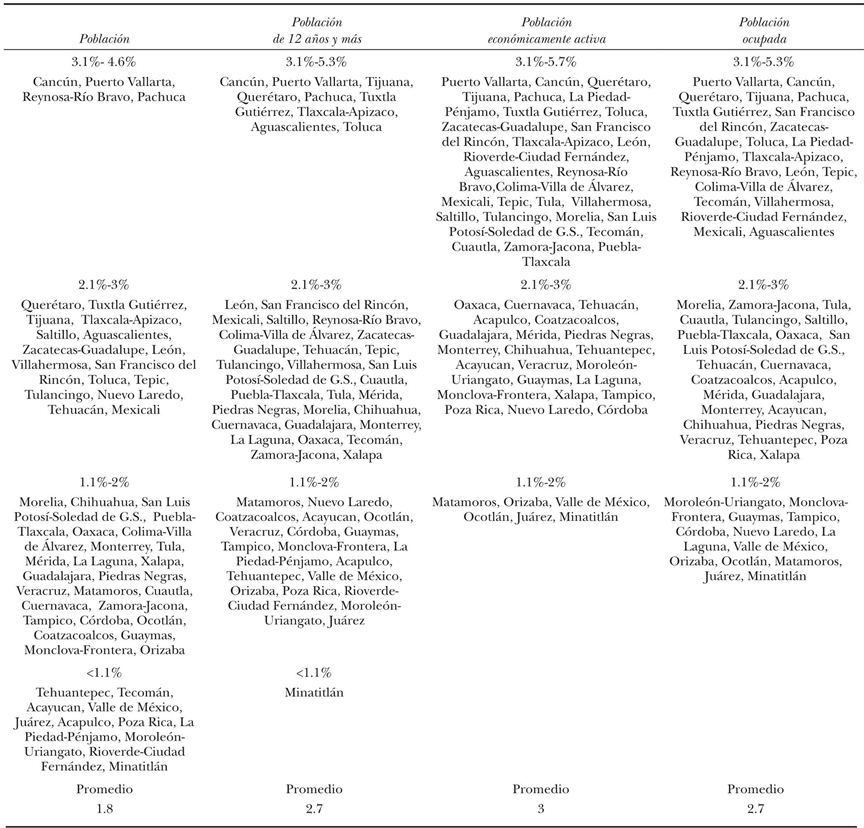 En ambos periodos Cancún y Puerto Vallarta fueron las metrópolis donde más crecieron la población en edad de trabajar, la población económicamente activa (PEA) y la población ocupada (PO). En Tijuana, Tuxtla Gutiérrez y Tehuacán también se observaron altas tasas de crecimiento de la población en edad de trabajar entre 1990 y 2000; Tehuacán, además de Oaxaca y Querétaro, se suma a Cancún y Puerto Vallarta como las zonas con mayor crecimiento de la PEA y la PO. Entre 2000 y 2010 Querétaro, Tijuana y Pachuca se situaron detrás de las citadas ciudades turísticas con las mayores tasas de crecimiento promedio anual en todos los rubros. De esta forma, en general destacan Tijuana, Cancún, Puerto Vallarta y Querétaro como las zonas metropolitanas más dinámicas en cuanto al crecimiento de su población, de la fuerza laboral, de la PEA y de la PO.