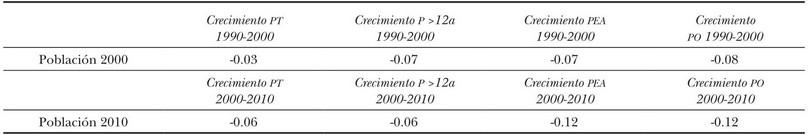 Con respecto a la relación entre los tamaños de las zonas metropolitanas y sus ritmos de crecimiento de población, de oferta laboral, de población económicamente activa y de ocupación, en el cuadro 4 se muestran las correlaciones estadísticas entre cada una de las tasas de crecimiento de las cuatro variables y la población absoluta en cada periodo. Las correlaciones efectivamente son muy bajas y negativas, indicativo de una débil relación entre la dinámica de crecimiento y el tamaño poblacional, así como la tendencia de crecimiento más lento de las zonas metropolitanas más grandes.