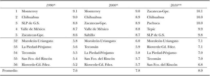 Monterrey, Chihuahua, el Valle de México, Zacatecas, San Luis Potosí y Saltillo aparecen con los mayores promedios de escolaridad, y los menores se observan en el grupo de zonas metropolitanas con menor tamaño y menor ritmo de crecimiento. En 2010 Monterrey y el Valle de México desaparecieron de las primeras cinco posiciones, pero tradicionalmente han presentado altos valores en este rubro. El promedio de todas las metrópolis indica aumentos generales de escolaridad en el México metropolitano (cuadro 5).