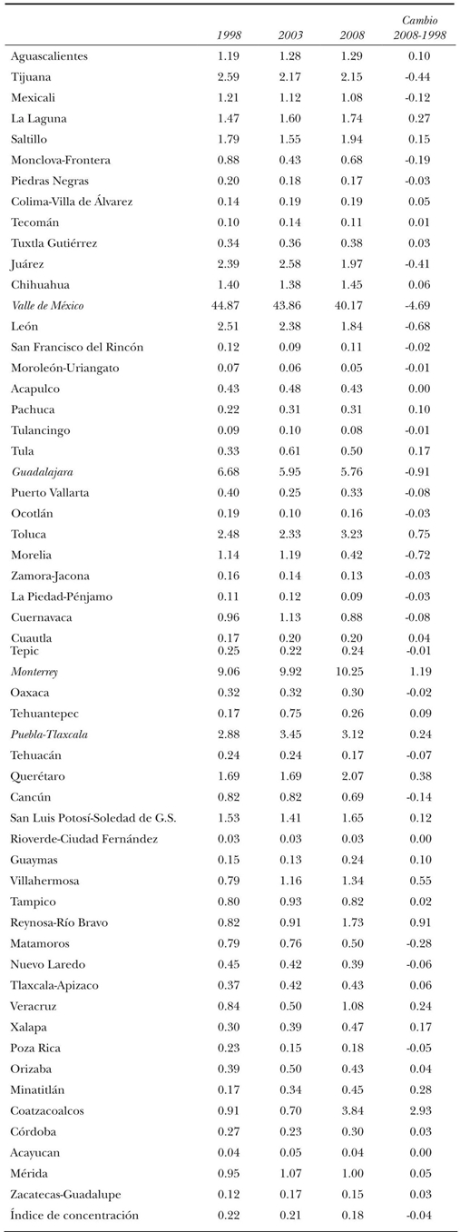 CUADRO 6. Participación por ZM en el total de valor agregado e índice de concentración, 1998, 2003, 2008
