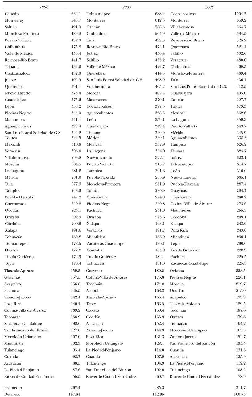 En 2003 Tehuantepec y Tula aparecen entre las primeras cinco posiciones (cabe advertir que su actividad está muy relacionada con el petróleo, cuyas rentas se emplean desde la federación). En 2008 Coatzacoalcos, cuyas características son similares a Tula y Tehuantepec en su principal actividad productiva, se posicionó con el PIB per cápita más alto; se agregan a ese cuartil Veracruz y San Luis Potosí. Entre 1998 y 2008 Tijuana, Ciudad Juárez, Cancún y Puerto Vallarta cayeron significativamente. Querétaro en cambio mostró un incremento sustancial.