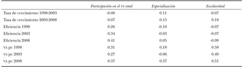 Estas correlaciones simples muestran una relación moderada de la especialización o composición sectorial únicamente con las tasas de crecimiento económico. El tamaño de la economía en cada ZM guarda cierta relación con la eficiencia económica y con el valor agregado per cápita. La relación más fuerte de todas las referidas se da entre la escolaridad y el valor agregado per cápita.