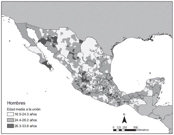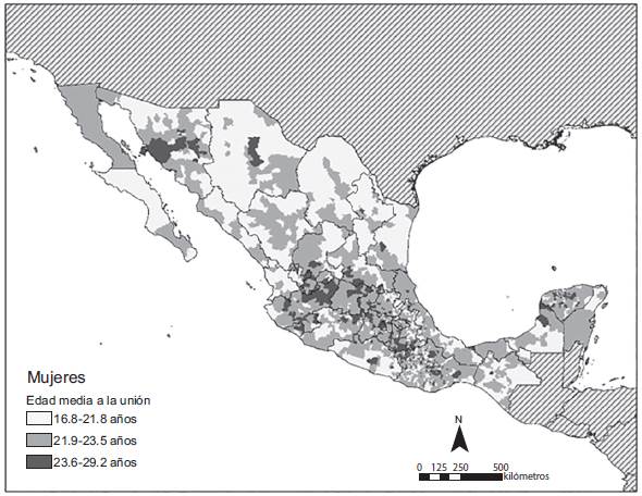 En 2010 la edad media a la unión de las mujeres es de 23 años y la de los hombres de 25.4 años.2 Los mapas 1a y 1b muestran la edad promedio a la unión para mujeres y hombres a nivel municipal. En general, la distribución espacial de este indicador para el caso de las mujeres muestra edades bajas (21.8 años o menos) en todo el Norte y en parte del Pacífico Sur, en tanto que las edades altas (23.6 años o más) destacan en el Noroeste, Occidente, Centro y parte de la Península de Yucatán. En el caso de los hombres los municipios con edades bajas (24.3 años o menos) se localizan en el Norte, parte del Pacífico Sur y en la Península de Yucatán, mientras que los municipios con edades altas (26.3 años o más) se sitúan en partes del Noroeste, Occidente y Centro.