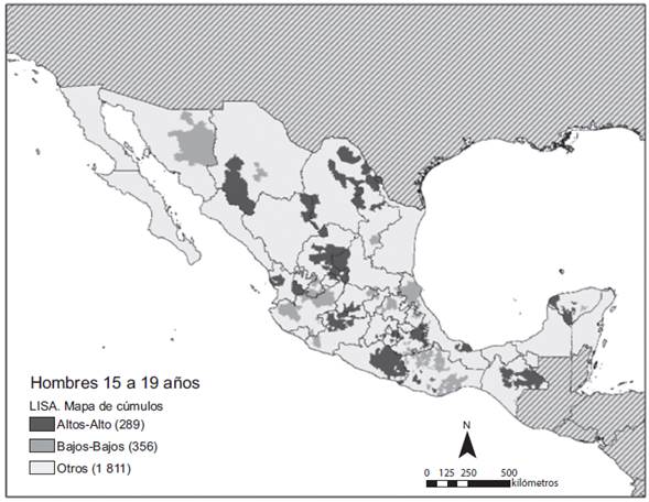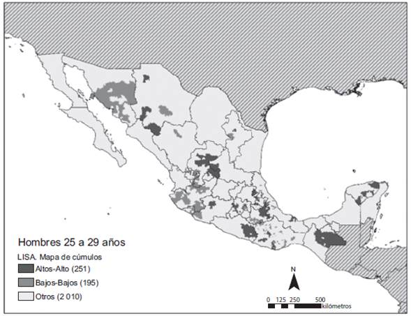 También se destaca que el número de municipios que conforman estas agrupaciones, tanto las de valores altos como las de bajos, disminuye a medida que aumenta la edad. Este comportamiento es consistente con el descenso del valor de la I de Moran global descrito anteriormente. A partir de estos resultados se puede decir que el calendario de la unión para las mujeres es temprano en el Norte, Pacífico y Sureste, y tardío en el Centro y Occidente. También es posible concluir que, a medida que aumenta la edad, las divergencias entre los municipios en términos de las proporciones de jóvenes unidos se reducen, aunque es cierto que prevalecen demarcaciones que se diferencian significativamente de su entorno.