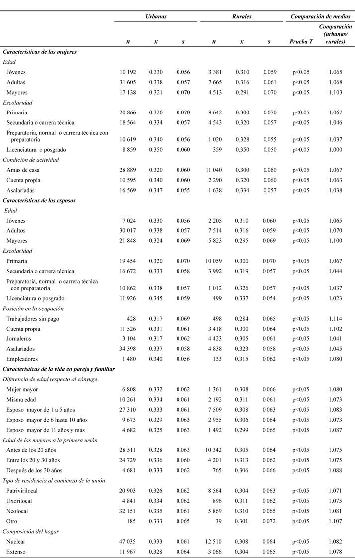Resulta, sin embargo, paradójico observar que las jóvenes rurales (menores de 30 años) tengan una ligera ventaja respecto a sus pares urbanas en este índice (4%). Ventaja que también se registra para las mujeres rurales cuyos maridos son jóvenes (menores de 30 años). En cambio, las rurales más rezagadas respecto a las urbanas son las adultas (de 30 a 49 años) y las unidas con varones de este mismo rango de edad, puesto que el valor de sus índices son 17% menores en ambos casos.